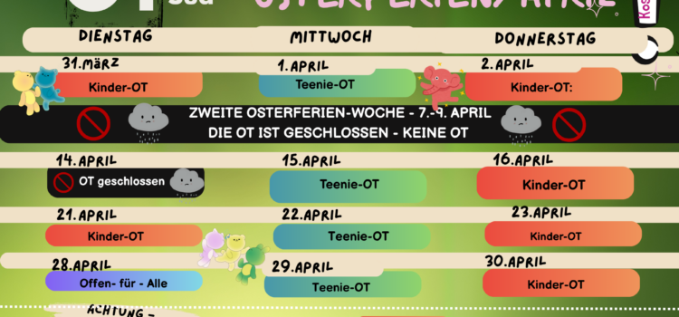 Öffnungszeiten OT Beuel-Süd April 1.Osterferienwoche: reguläre OT-Öffnungszeiten https://www.evangelisch-beuel.de/oeffnungszeiten/ 2.Osterferienwoche: geschlossen 21.-30.April: reguläre OT-Öffnungszeiten 28.April: Offen-für.Alle-OT – für Kinder und Teenies